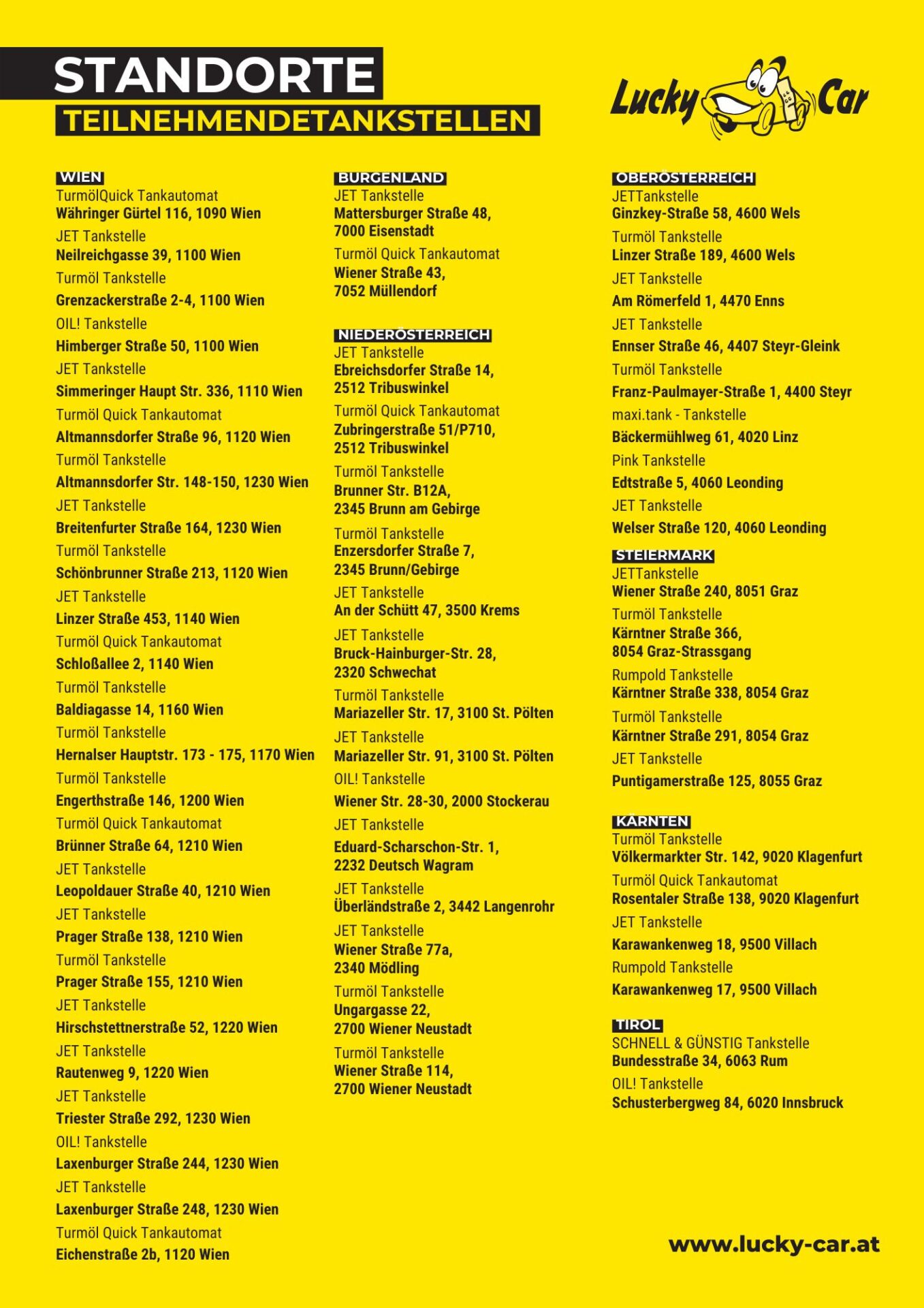 Der Rechtsweg ist ausgeschlossen. Keine Barablöse möglich. Pro Person ist nur eine Teilnahme pro Woche zulässig. Mitarbeiter der Firma Lucky Car und Firmenkunden sind an der Teilnahme des Gewinnspiels ausgeschlossen. Ebenfalls ausgeschlossen sind mit den Mitarbeitern persönlich oder wirtschaftlich verbundene Personen. Der Veranstalter behält sich das Recht vor, das Gewinnspiel jederzeit ohne Vorankündigung zu beenden oder zu ändern.